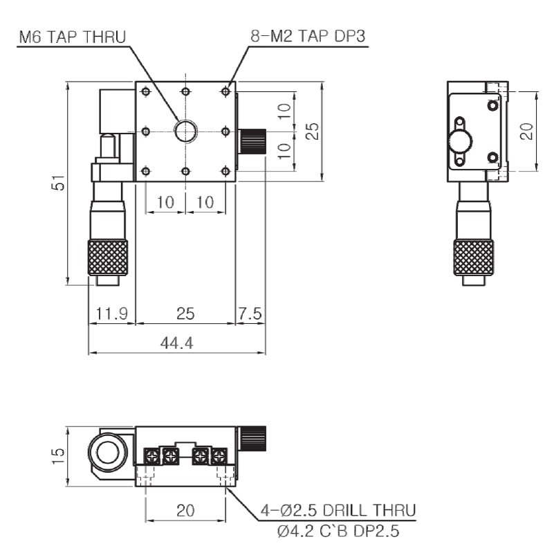 | HJX-25R | 25×25mm | Right | ±3.25mm | 10μm | Linear Ball Guide | 1.2kgf | 30μm | 10μm | 0.06kg | Aluminum | Black Anodizing |