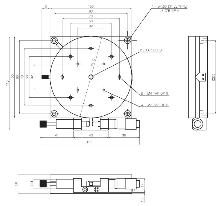 HJCR-100L φ100 Left Coarse: φ360° Fine: ±5° 10μm 5.0kgf 60μm 50μm 0.8 kg Aluminum Black Anodizing