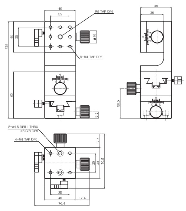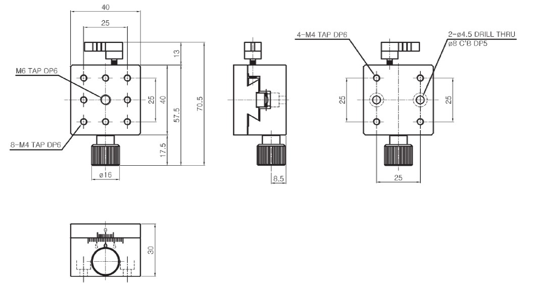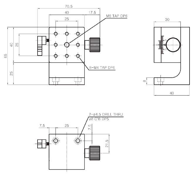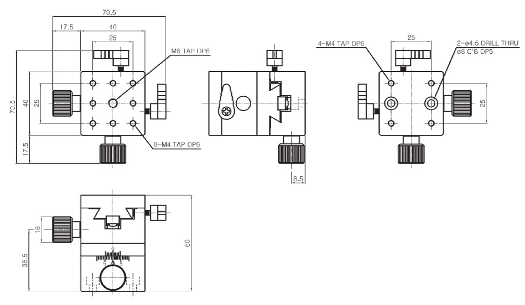| HJD1-44P | 40×40 mm | ±10 mm | Dovetail,Rack &Pinion | 0.1mm/Vernier | 40μm | 30μm | 2.5kgf | X | 0.15 kg | Aluminum | Black Anodizing |
