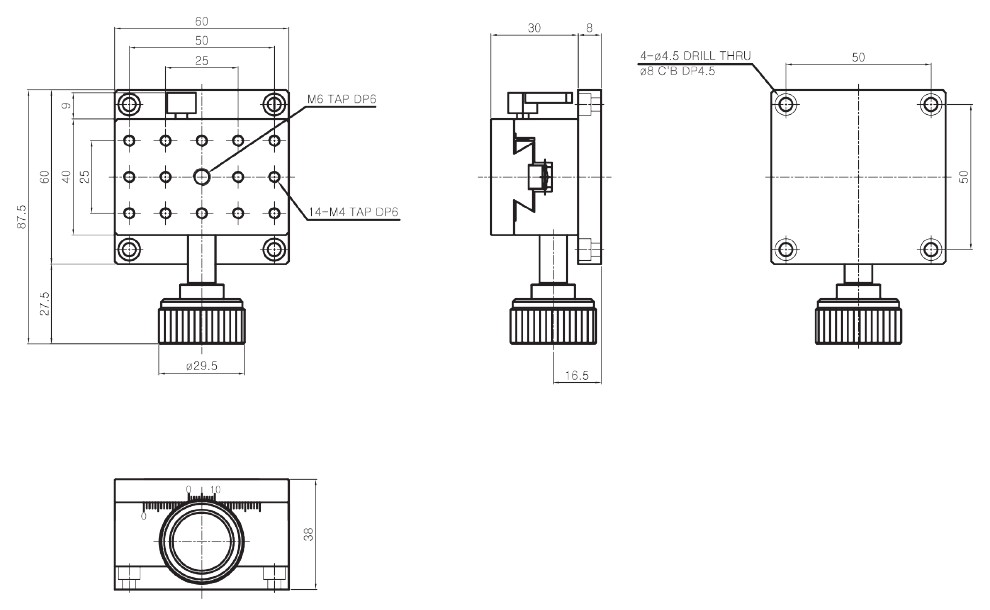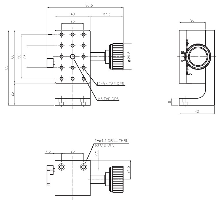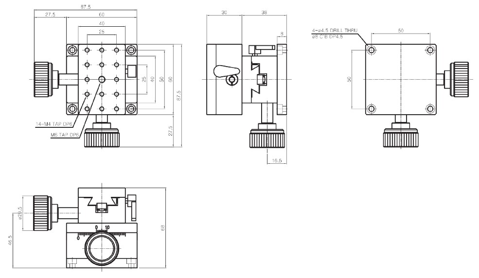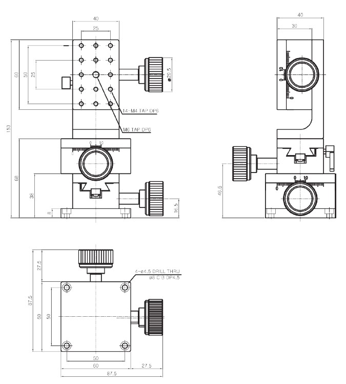 | HJD1-46P | 40×60 mm | ±20 mm | Dovetail,Rack &Pinion | 0.1mm/Vernier | 40μm | 30μm | 3kgf | X | 0.28 kg | Aluminum | Black Anodizing |