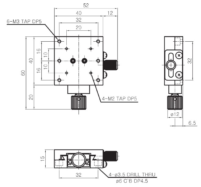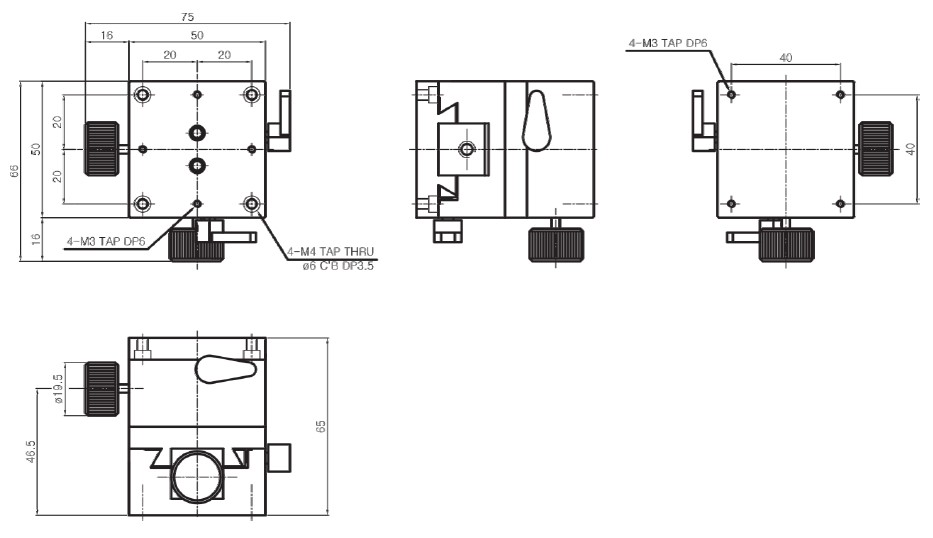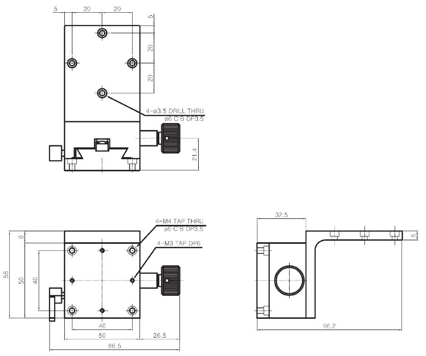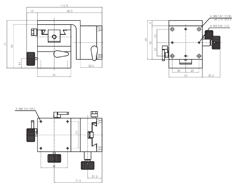 | HJD3-55S | 50×50mm | ±10 mm | Dovetail, Rack & Pinion | 0.1° /Vernier | 60μm | 30μm | 1.8kgf | 0.24 kg | Aluminum | Black Anodizing |