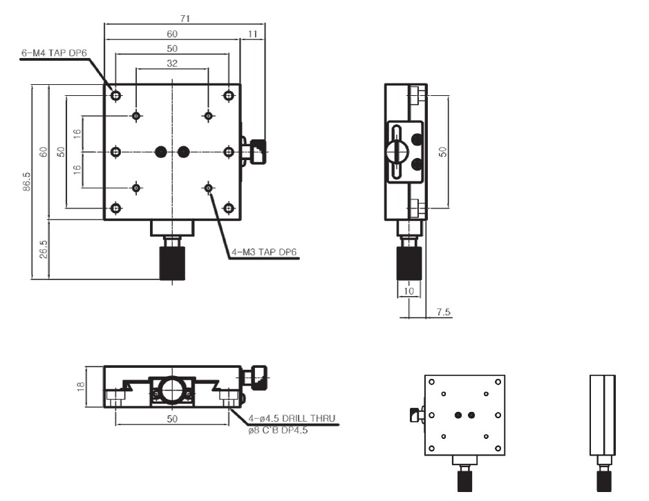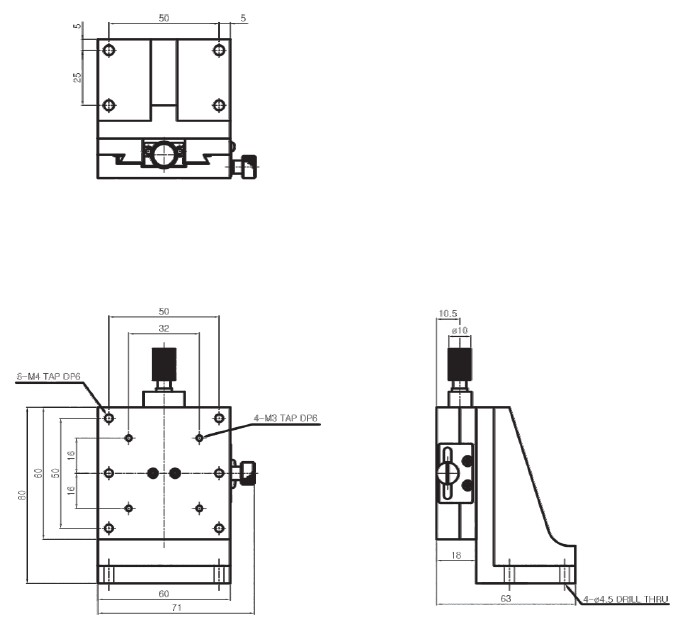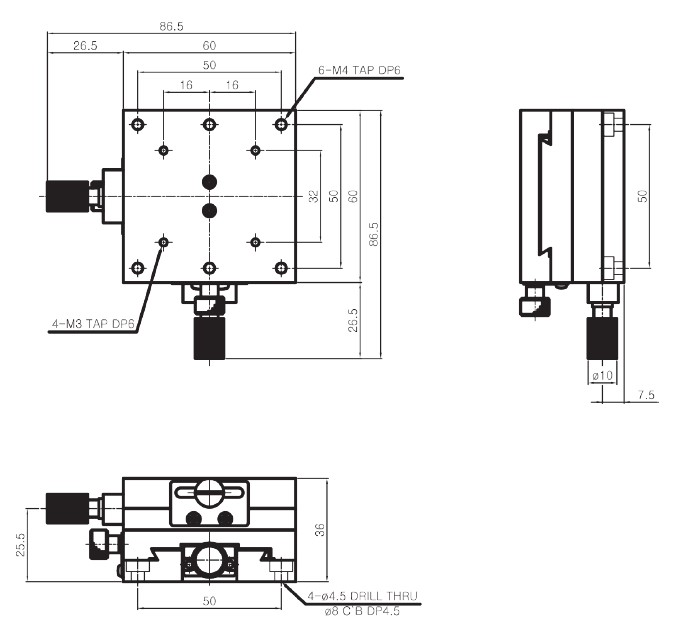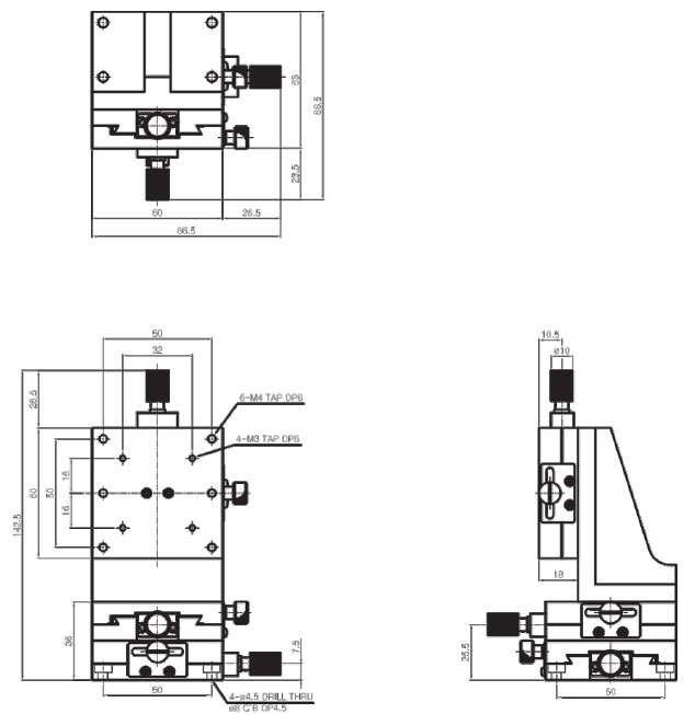 | HJD3-60S | 60×60mm | ±15 mm | Dovetail, Screw | 0.1° /Vernier | 60μm | 30μm | 1.5kgf | 0.22 kg | Aluminum | Black Anodizing |