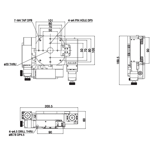 HJMU-200 200×200mm ±20/ ±20/ ±4° Crossed-Roller guide, Cross Roller ring 2μm(Full step) 10mm/秒(基於5相馬達) Ø8,