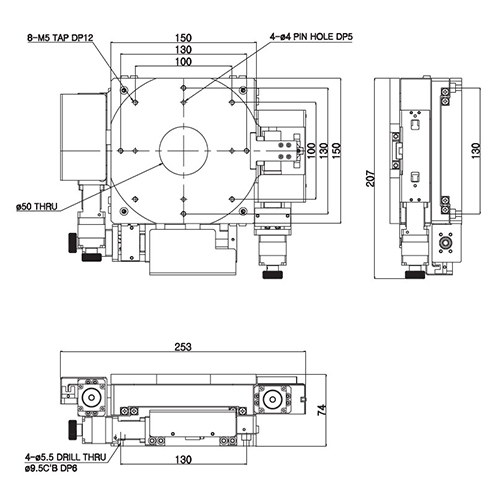 HJMU-150 150×150mm ±20/ ±20/ ±5° Crossed-Roller guide, Cross Roller ring 2μm(Full step) 10mm/秒(基於5相馬達) Ø8,