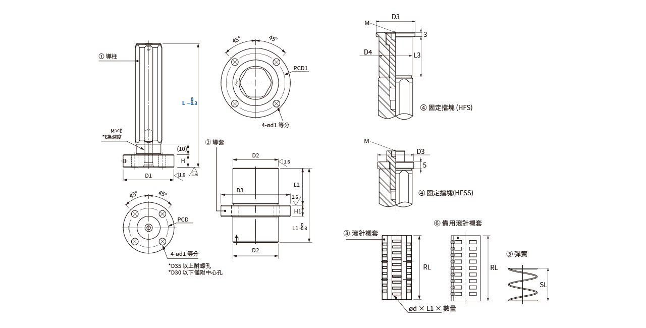| D | L | ① 導柱 | ② 導套 | |||||||||