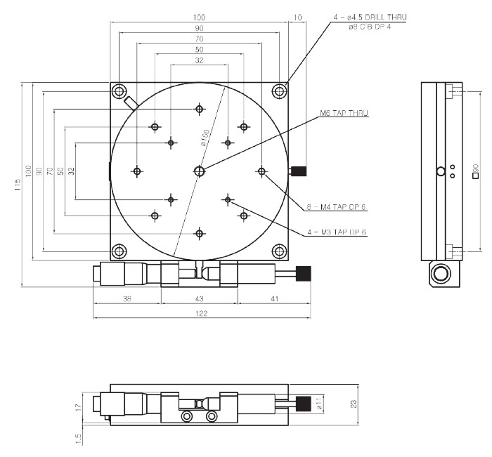 HJCR-100L φ100 Left Coarse: φ360° Fine: ±5° 10μm 5.0kgf 60μm 50μm 0.8 kg Aluminum Black Anodizing
