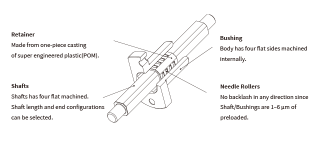 High accuracy needle rollers are arranged in four directions against the square shafts. Shafts / Bushings are designed to be 1–6 μm preloaded.