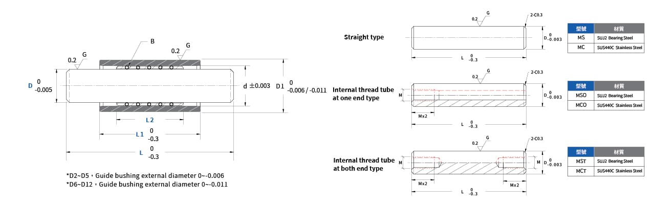 D3~D12˙material SUJ2/SUS440C˙Guide set Straight type-Wall thickness standard type˙Steel Ball Diameter1.0mm˙Guide set shape three option(straight type/One end inner thread type/two ends inner thread type)