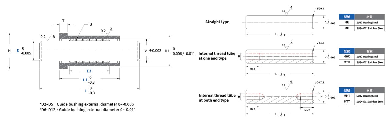 D3~D12˙material SUJ2/SUS440C˙Guide set Head type-Wall thickness standard type˙Steel Ball Diameter1.0mm˙Guide set shape three option(straight type/One end inner thread type/two ends inner thread type)