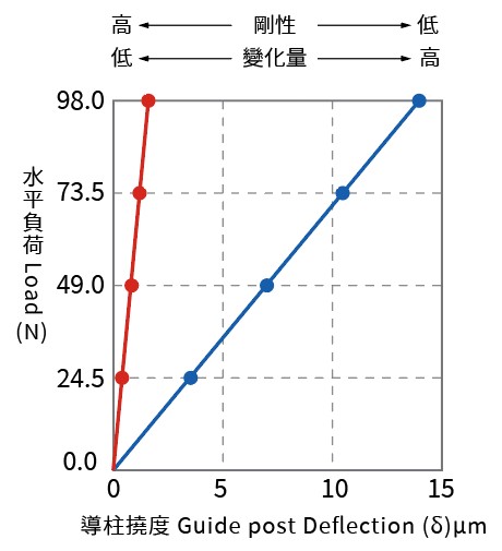 ![]() 滾針型導柱:在水平負荷下, 撓度(變化量)低於 5μm ![]() 滾珠型導柱:在水平負荷下, 撓度(變化量)已接近 15μm |