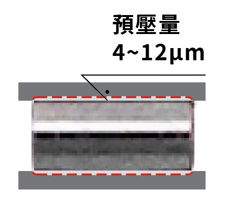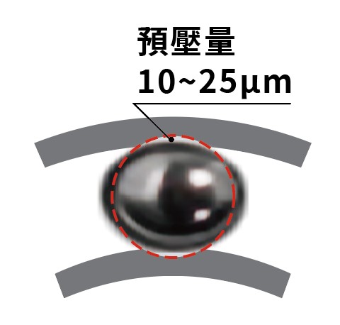 3. 低預壓(振動) 滾珠型導柱的高預壓量為 10~25μm,雖然可提昇剛性,但鋼珠進入時容易發生突發衝擊和振動且縮短壽命,而使用高精度滾針預壓量只有 4~12μm 的微量值,無晃動能確保高精度,且保持剛性的同時成功降低了預壓,實現了超低振動的平滑滾動。 |