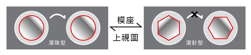 2. 高剛性 從點接觸轉變為線接觸面積較寬的高精度滾針,滾珠與滾針的接觸 面積比約相差 10 倍,滾針能提升導柱與導引襯套之間的剛性,能使模具沖頭與沖模間的間隙保持均勻,不容易發生偏移,也能抑制出現毛邊,生產出高質量產品。 |