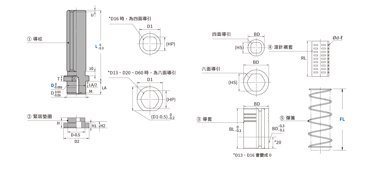 型號 | SKS3 / SUJ2 | 導柱外徑 D | 導柱長度 L | 彈簧長度 FL |