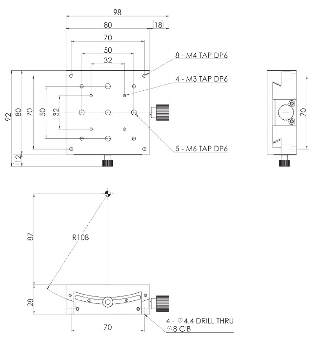 HJT-8087L 80×80 mm 87 mm ±15° 0.1° /Vernier ≒0.9° Dovetail, Worm & Gear 8kgf 0.53kg Aluminum Black Anodizing