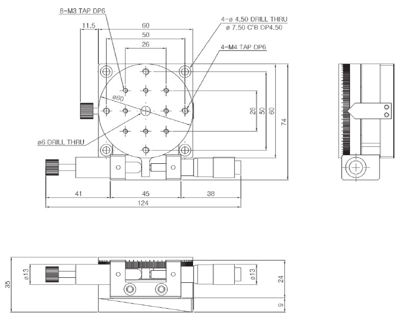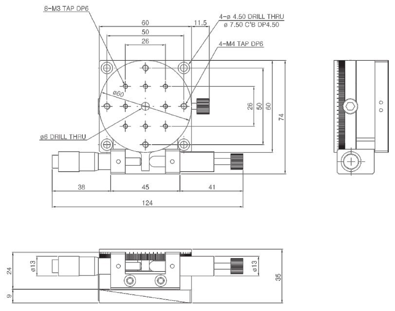 | HJCRT-60L | φ60 | Left | Coarse: φ360° Fine: ±5° | 10μm | 1° | 8.0kgf | 30μm | 30μm | 0.5 kg | Aluminum | Black Anodizing |